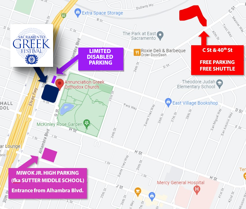Short walk up Alhambra to the Greek Festival | Free shuttle to & from Greek Festival | Limited parking - First come, first served | Free entry into Greek Festival |